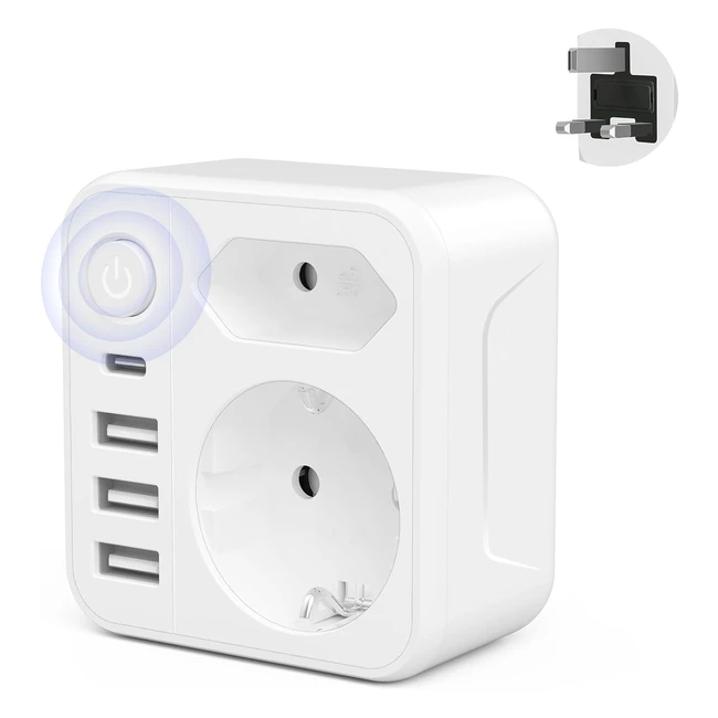 -5%Adaptateur prise UK vers France 6en1 avec interrupteur pour une puissance jusqu'à 4000 watts. 3 prises USB 5V 2.4A, 1 prise Type C 5V 3A. Sécurité certifiée CE, FCC et RoHS. Compact et portable pour voyages d'affaires. #Adaptateur #PriseAnglaise #Voyage #Sécurité #Puissance #USB #TypeC #Compact #Portable #Certifié