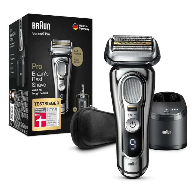Brauns bester Elektrorasierer Testgewinner bei Stiftung Warentest mit Gesamtnote 1,6 10/2021. Der Series 9 Pro ist der effizienteste Rasierer von Braun, jetzt noch besser mit Pro Head. Effizient und sanft, egal ob 1, 3 oder 7 Tage Bart. Dieser Herren-Trockenrasierer verfügt über den einzigartigen Prolift Trimmer, der schwer erreichbare Haare anhebt und schneidet. Effizienter im Vergleich zum vorherigen Braun Series 9 und sanft. Die innovative Prolift Trimmer und die einzigartige Braun Sonic-Technologie helfen, bis zu 10 % schneller zu rasieren im Vergleich zum vorherigen Braun Series 9, während sie sanft zur Haut sind. Mit Braun 5in1 Reinigungsstation SmartCare Center für einen Rasierer, der jeden Tag auf Knopfdruck gemacht wird. Hergestellt in Deutschland, dieser Elektrorasierer ist zu 100 % wasserdicht und kann mit Schaum, Gel oder sogar unter der Dusche verwendet werden.