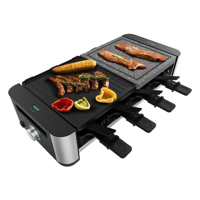 Cecotec Raclette Cheesegrill 16000 Inox Mixgrill 8 personnes - Grill 1400W - Plaques Aluminium 20x22cm et Pierre Naturelle - 8 poêles et 8 spatules