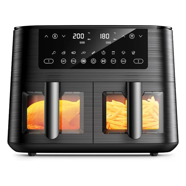 Doppelzone Heißluftfritteuse mit Sichtfenster 9L XL Kapazität Doppel Airfryer 2 Schubladen 9in1 Kochmodi Touchscreen Smart und Timer Funktion Gesunder Fritteuse ohne Öl und fettarmes Kochen