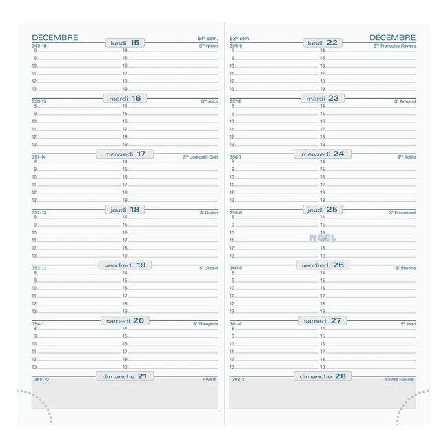 Recharge SL17 sans couverture pour éviter de jeter la couverture de l'année précédente. Une semaine par page, la quinzaine en face à face. Grille horizontale, RDV sur 6 jours de 8h à 19h. Impression en bleu et gris sur papier bleuté Clairefontaine. Reconnu pour sa qualité et pour permettre une écriture douce et fluide. Tranche dorée, coins détachables pour accéder rapidement à la semaine en cours. Pages spécifiques : calendriers semestriels de l'année en cours et de l'année suivante, planning mensuel de l'année en cours et de l'année suivante, listes des jours fériés de l'année, listes des codes départementaux, infos pratiques, atlas amovible en couleurs, planisphère, cartes de l'Europe, l'Asie, l'Afrique, les Amériques, les États-Unis, la France, la région parisienne, les transports parisiens, carnet d'adresse amovible. Certifications : PEFC, fibres de papier issues de forêts gérées durablement, Imprim'Vert. Fabriqué en France et pensé pour vous.