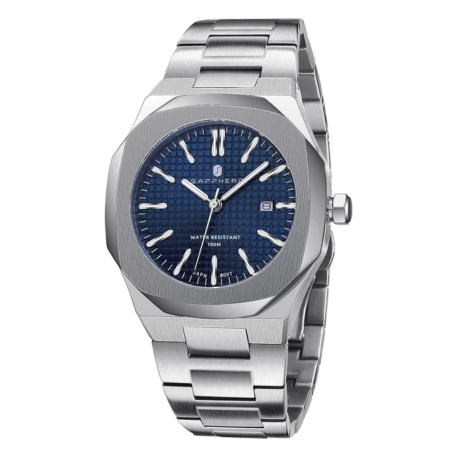Montre Homme Sapphero Quartz Argent Acier Inoxydable Bracelet 100m Étanche Date Calendrier Noir Bleu