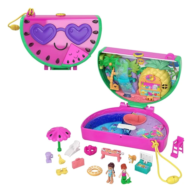 Polly Pocket Watermelon Pool Party Compact Playset HCG19 - Scented Feature, 2 Micro Dolls, 12 Accessories