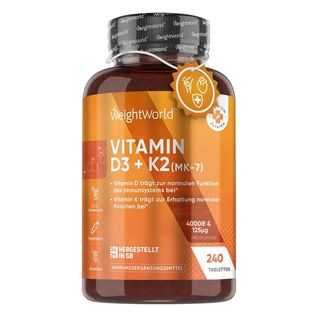 -15%Holen Sie sich jetzt unsere hochdosierten Vitamin D3 K2 Tabletten mit 997 bioverfügbarem Alltrans MK7 und genießen Sie die besten Vorteile für Ihre Gesundheit. Mit 4000 IE Vitamin D3 und 100 mcg Vitamin K2 bieten wir Ihnen den optimalen Rundumschutz für Ihr Immunsystem und Ihre Gesundheit. Nehmen Sie einfach alle 4 Tage eine Tablette ein und stärken Sie Ihr Immunsystem, Knochen, Zähne und Muskeln. Unsere nachhaltigen und laborgetesteten Tabletten enthalten keine Zusatzstoffe oder Aromen. Bestellen Sie jetzt!