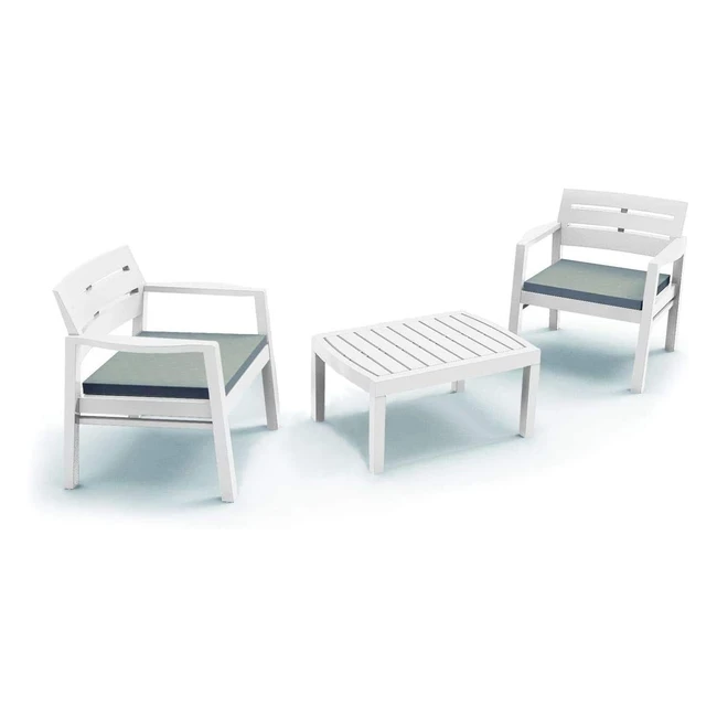 -18%Offre spéciale! Salon intérieur et extérieur avec 2 fauteuils, 1 table basse et coussins blancs. Fabriqué en Italie en polypropylène résistant. Parfait pour profiter du soleil et de la pluie. Facile à nettoyer. Convient aux espaces intérieurs et extérieurs. Idéal pour des moments en famille et entre amis. Dimensions: Fauteuils 72.5x65x74.5, Table Basse 78x55x38 cm.