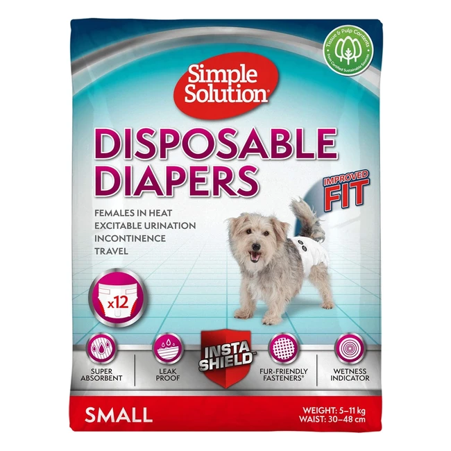 A better fit! Simple Solution small disposable dog diapers with new adjustable fit sizes are for female dogs that weigh 5-11kg. With a 30cm-48cm waist, these female dog diapers feature a stretchable fabric that fits snugly around your pet. Absorbent and leakproof, the super absorbent core locks in all moisture while leakproof barriers provide added mess prevention. Guaranteed to work with stretch waistband protection. Your girl dog can move around freely while staying dry. No mess! Simple Solution disposable dog diapers have a leakproof fit that gives your dog freedom of movement without compromising on security. The tailhole and extra-long wings help them stay put on the wiggliest of dogs. For extra added protection, use with Simple Solution disposable liners. Fur-friendly! Attaching and removing the diaper is safe and easy with fur-friendly fasteners. Designed with your dog's fur in mind, the diaper stays in place on your female dog without her fur getting stuck to the folds. So atta