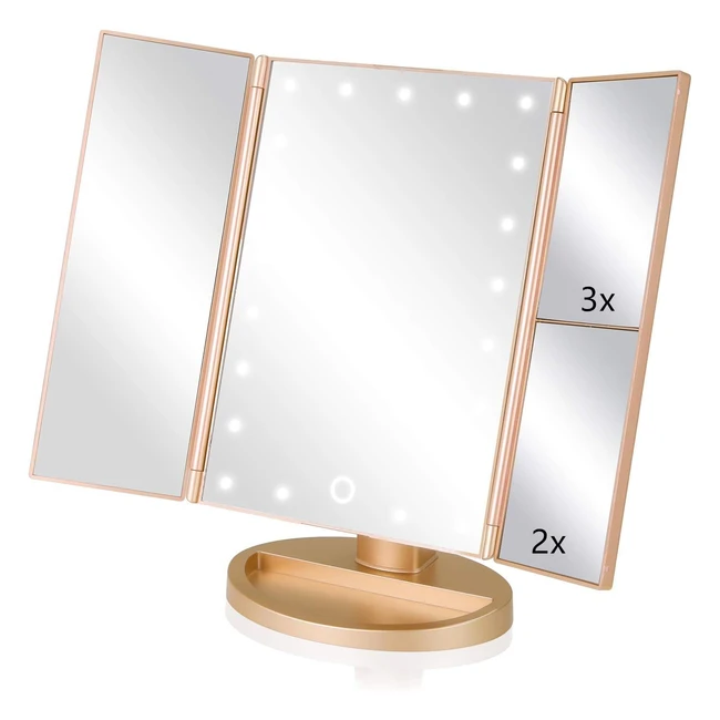 Specchio da trucco con luce LED regolabile a 180° per un'applicazione perfetta del trucco. Design triplice pieghevole per un uso comodo e pratico. Ideale come regalo per le donne. Batterie AAA o cavo USB inclusi.