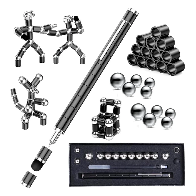 Get the Waksox Fidget Pen - a magnetic toy pen that's perfect for teens! This pen comes in a gift box and includes 13x magnetic rings, 2x small steel balls, 8x medium steel balls, 2x large steel balls, 3x black 05mm water pen refills, and 2x touch screen pen tips. It's a stress-relieving toy and a normal writing ballpoint pen. With its magnetic feature, you can rotate and convert it into various creative shapes. Perfect for ages 8-15, this pen is a great gift idea for kids, teenagers, teachers, students, doctors, engineers, lawyers, and designers. Get yours now and refill positive energy!