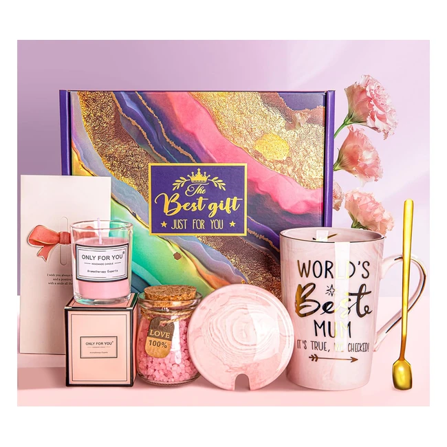 Perfect Mothers Day & Birthday Gift for Mum! Our beautifully designed gift box includes a 14 oz pink marble ceramic mug with loving words, pink rose bath salts, soy wax scented candle, and a heartfelt greeting card. Give your mum the gift of relaxation and joy with this thoughtful set. Suitable for mothers, sisters, friends, and more. High quality and safe products. Satisfaction guaranteed!