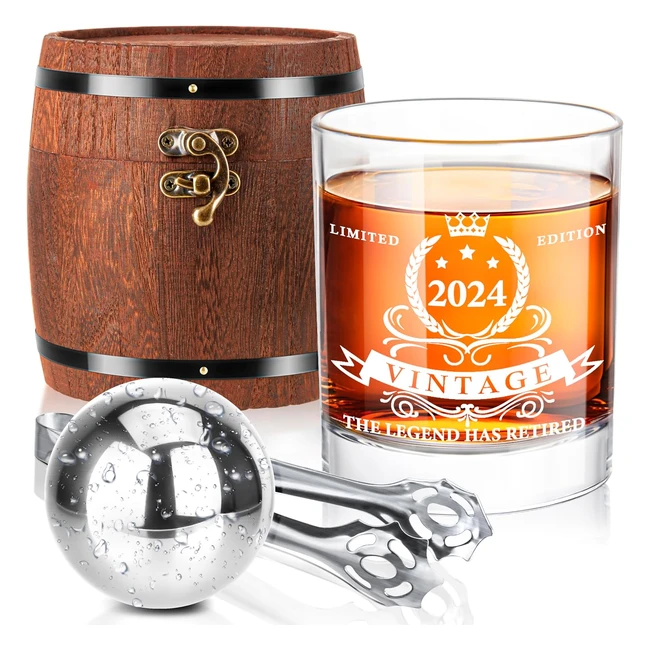 Unique retirement gifts for men in full set. Wonderful retirement gifts for men 2024. Includes valued barrel gift box, 12 oz retirement whiskey glass, XL whiskey ball, stainless steel tong. Best retirement gifts for grandpas, dad, husband, friends, coworkers, boss, brother. Amazing barrel gift box with stunning retirement bourbon glass gift set in premium handcrafted wooden barrel box. High-end wood with metal bands and sturdy hardware lock. Packaged well to prevent scratches or breakage. Extra large whiskey ball for better drinks tasting experience. Made of food grade stainless steel. Premium prints on whiskey glass. Satisfaction guarantee - money back if not satisfied.