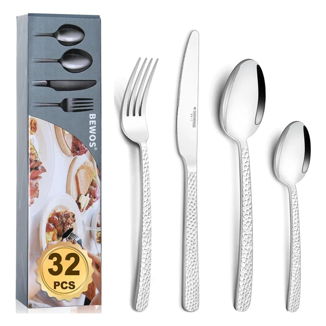 32-Piece Bewos Silverware Set for 8 | Stainless Steel Flatware Cutlery Set | Mirror Polished Utensils | Forks Spoons Knives | Home Kitchen Restaurant Hotel | Dishwasher Safe