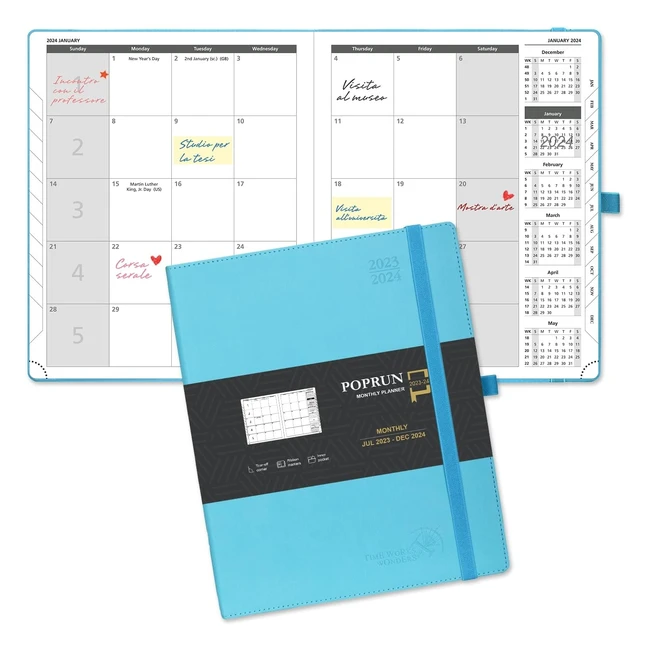Agenda 2023-2024 Mensile 265 x 215 cm - PopRun, Ref. 18 - Pelle Vegana, Copertina Morbida - Blu Verde