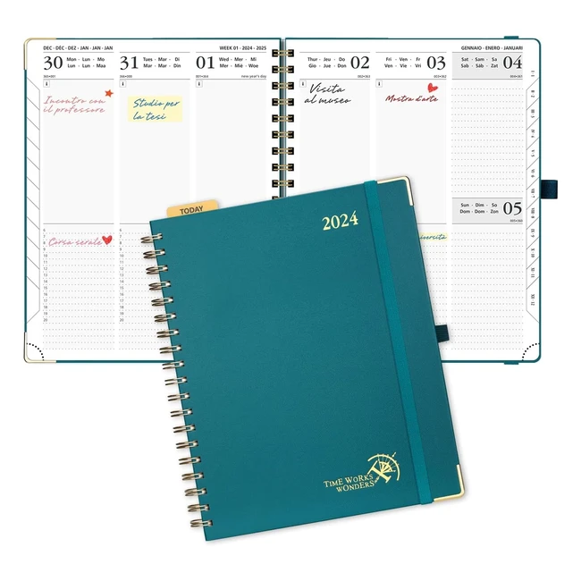 Agenda 2024 Settimanale Verticale 255 x 205 cm Planner 2024 Spirale B5 - Pelle Vegana - Carta Spessa 100 gsm FSC Verde Pacifico