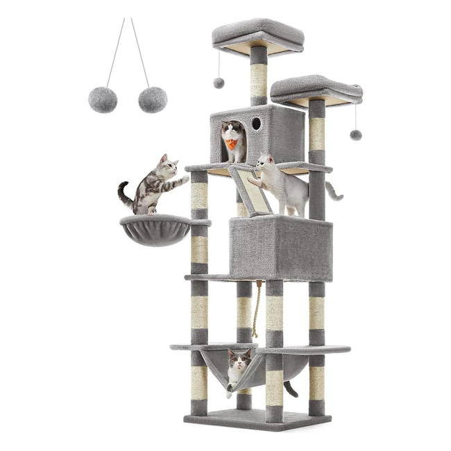 Arbre à chat FEANDREA hauteur 206 cm 13 griffoirs 2 plateformes 2 niches panier hamac pompon tissu peluche