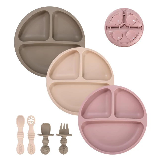 Assiette ventouse pour bb Sobeau 7 pices - Silicone sans BPA - 3 assiettes plates, 4 fourchettes et cuillres incluses
