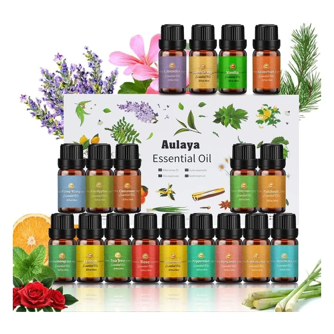 Aulaya Essential Oils Set 18x10ml Tea Tree Lavender Eucalyptus Lemongrass Rosemary Orange Mint Lemon Bergamot Ylang Ylang etc