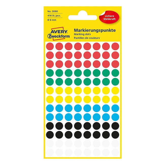 Avery Zweckform 3090 - Codici Diametro 8mm - 4 Fogli - 416 Pezzi - Colori Assortiti