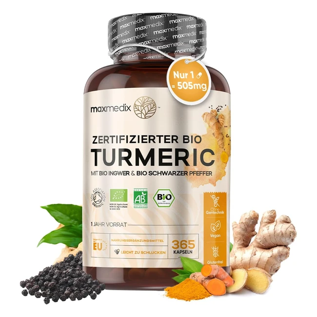 Bio Kurkuma Kapseln mit Bio Ingwer und Bio Schwarzer Pfeffer - 365 vegane Kapseln für ein Jahr - hohe Nährstoffaufnahme dank Piperin - 480 mg Kurkumapulver pro Kapsel - Bio-Qualität aus Europa