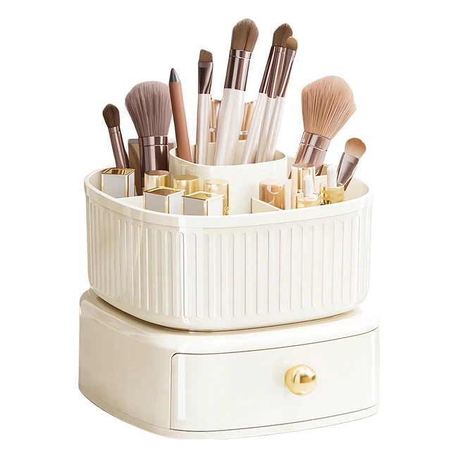 Get organized with this 2 in 1 makeup organiser featuring rotating storage and drawer compartments. Say goodbye to clutter and save desktop space with multiple compartments for all your beauty essentials. Made of high-quality ABS material, this organizer adds a touch of luxury to your dressing table. Easy to clean and waterproof, perfect for storing skincare, haircare, makeup, and more. Suitable for various rooms and purposes, from makeup brushes to office supplies. Shop now!