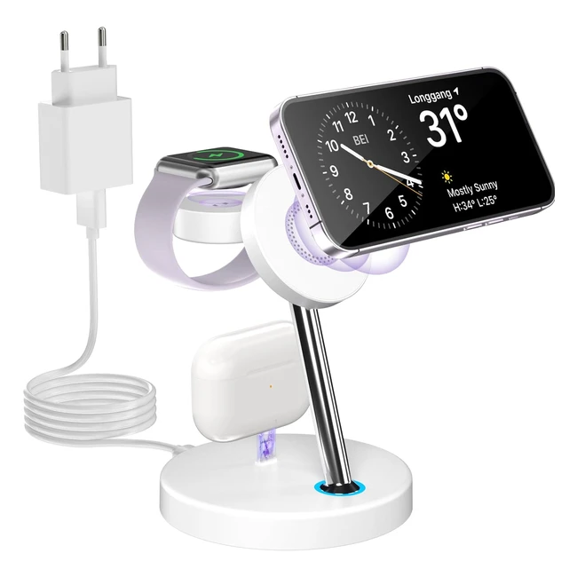 Caricatore MagSafe 3 in 1 per iPhone, Apple Watch e AirPods. Perfetto allineamento magnetico, compatibile con iPhone 15/Pro/Max/Plus, Apple Watch, AirPods. Design elegante, sicuro e affidabile. Libera la tua scrivania e rendi la tua vita più elegante. Include cavo USB-C, manuale d'uso e servizio clienti 24/7. Garanzia di un anno.