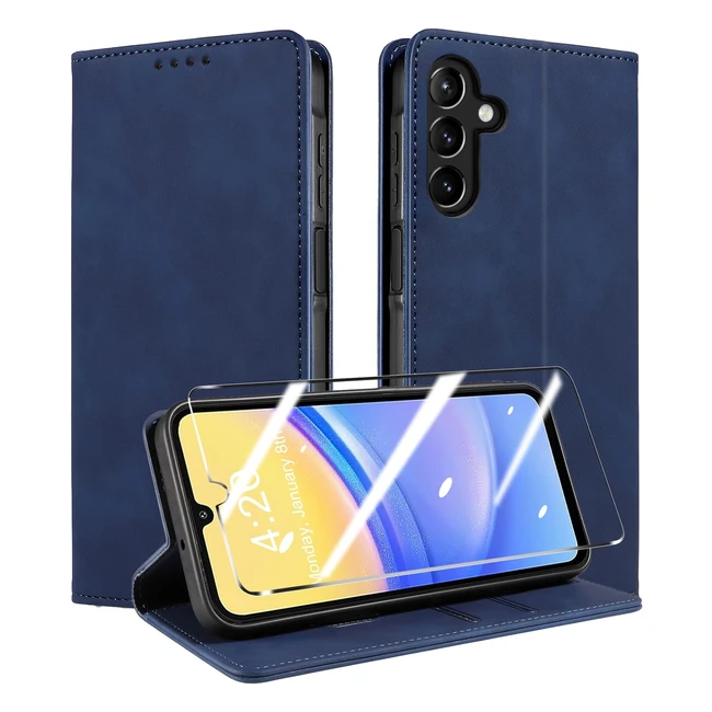 Coque Samsung Galaxy A15 4G5G avec Verre Tremp RFID Blocage - Etui Protection Premium Cuir PU - Bleu Fonc