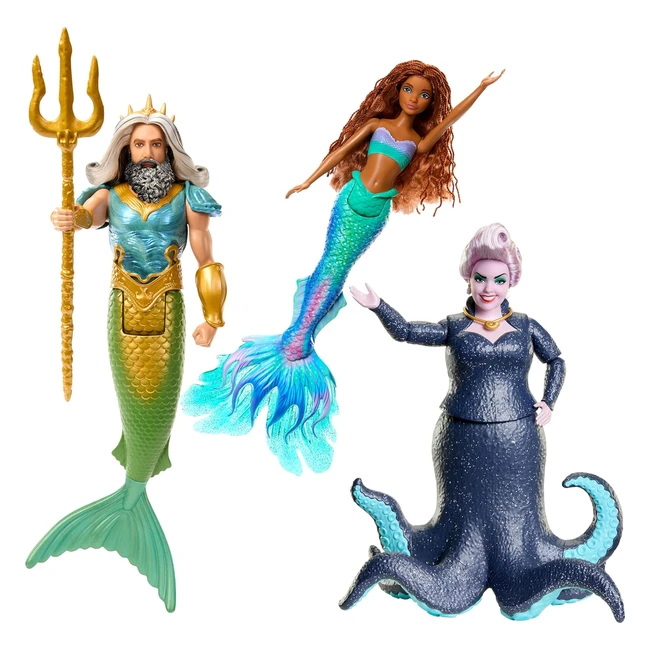 Offre limitée ! Coffret de trois poupées articulées inspirées du film Disney La Petite Sirène. Inclut le Roi Triton, Ursula et Ariel avec tenues emblématiques et accessoires amovibles. Stimule l'imagination des enfants dès 2 ans.