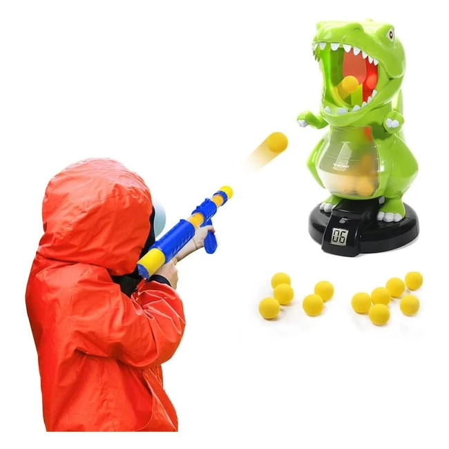 Novel dinosaur shooting game kit with electric scoring target, perfect for kids! Includes 1 dinosaur target, 24 foam balls, and 1 air pump gun. Digital LCD records score, multiplayer competition, safe foam balls, 360ft shooting range. Perfect for groups or solo play, suitable for all ages. Enhance eye-hand coordination and have fun with this indoor and outdoor game. Great Christmas, holiday, birthday gifts for kids, friends, and family members. Release stress and have a blast!