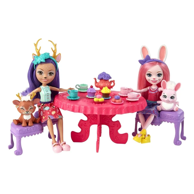 -54%Enchantimals Teeparty Spielset - Über 15 Teile - Mit Danessa Deer, Bree Bunny und Tierfreunden - Lass deiner Fantasie freien Lauf mit niedlichem Geschirr, Teekanne, Teetassen, Macarons, Cupcakes und mehr - Enchantimalspuppen ca15cm mit abnehmbaren Röcken, Schuhen und Haarreifen - Perfekt für eine magische Teeparty!