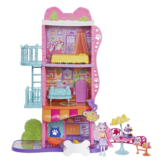 Enchantimals HJH65 City Tails Stadthaus Cafe Spielset mit Pomeranian Girl Palmer Pomeranian Puppe und Hund Figur inklusive Zubehör Spielzeug für Kinder ab 4 Jahren