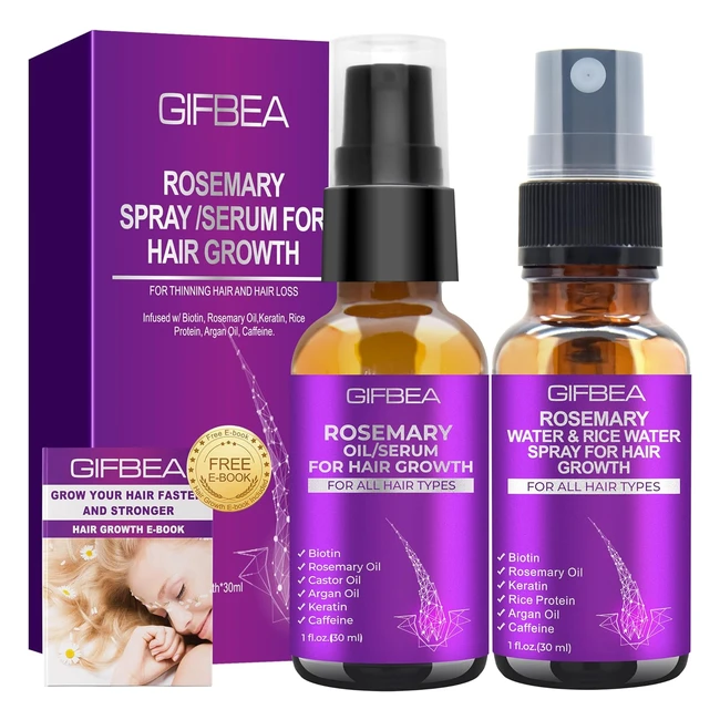 Gifbea Rosemary Oil Serum for Hair Growth w/Rosemary Water & Rice Water Spray - Biotin, Castor Oil, Argan Oil, Caffeine, Keratin - Reduce Hair Loss - Hair Thickening Products Treatment for Women Men