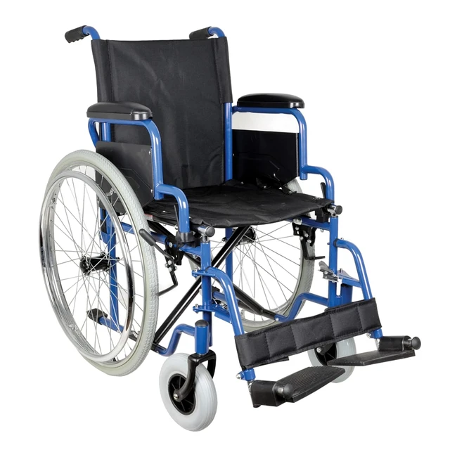 Carrozzina con telaio in acciaio blu, ruote posteriori pneumatiche 61 cm, ruote anteriori solide in PU 20 cm. Freni di bloccaggio, braccioli imbottiti alzabili, seduta in nylon nero. Poggiapiedi removibili in alluminio, pedana alzabile.