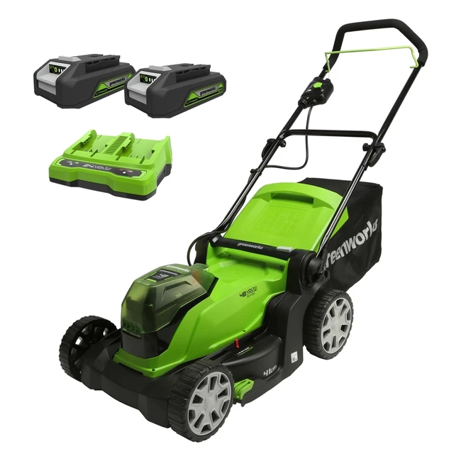 Greenworks G24X2LM41K2X Akkurasenmäher für Flächen bis zu 220 m, 41 cm Schnittbreite, 50 Liter Fangsack, zwei 24 V Batterien und Doppel-Ladegerät