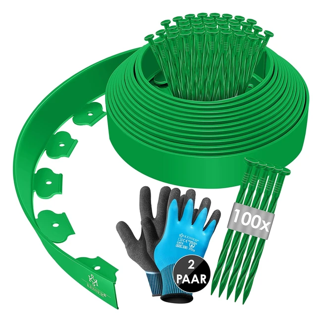 Kesser Flexibler Kunststoff-Rasenkante Länge 20 m Höhe 5 cm mit 100 Bodenankern inkl. 2 Paar Handschuhe - Blumenbeet Einfassung Rasenkante Mähkante Pflastersteine Palisade