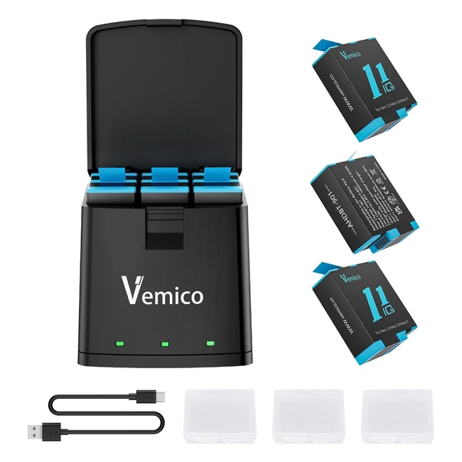 Kit Chargeur Batterie Vemico Hero 11 3 Pack 1800mAh TypeC LED 3 Canaux AHDBT901 Gopro Hero 12 Black