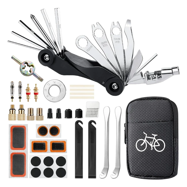 -15%Kit réparation vélo 37 pièces - Outil vélo 17 en 1, clé rayons, kit anticrevaison, démonte-pneus, rustines, râpe métallique, mandrins valve Schrader/Presta, adaptateurs valve, clé mandrins, chapeaux valve, élastiques, sac rangement. Outil multiple 17 en 1: clé fourche 8/9/10mm, tournevis, clés hexagonales, clé rayons, décapsuleur, extracteur rivets chaîne, couteau acier inoxydable. Pratique, compact, léger. Rustine préencollée, matériaux qualité: alliage aluminium, ABS. Utilisations multiples pour vélos, scooters, motocross, camping, sports plein air, réparations domestiques.