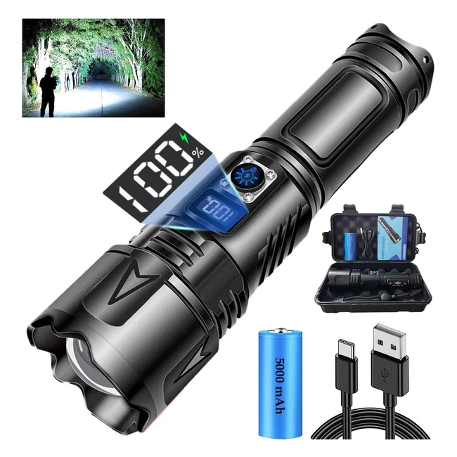 Lampe de poche ultra puissante USB-C rechargeable 100000 lumens - Lampe torche LED IP65 étanche - Tactique, 5 modes zoomables - Batterie 5000mAh