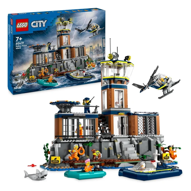 LEGO City Polizeistation auf Gefängnisinsel Polizeispielzeug mit Hubschrauber Boot und Hai Set von 7 Minifiguren und Hund Geschenk für Jungen und Mädchen ab 7 Jahren 60419