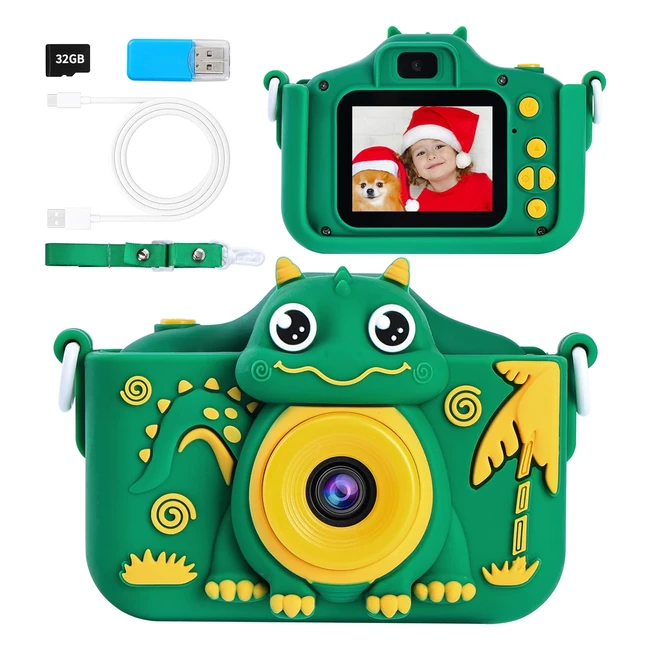 Nuova macchina fotografica per bambini 2024 con custodia per dinosauri. Porta di ricarica di tipo C comoda. Fotocamera multifunzionale con giochi di puzzle. Doppio obiettivo da 40MP e schermo 1080p HD da 20 pollici. Batteria ricaricabile da 1000mAh e scheda SD da 32GB inclusa. Regalo ideale per bambini dai 3 ai 10 anni.