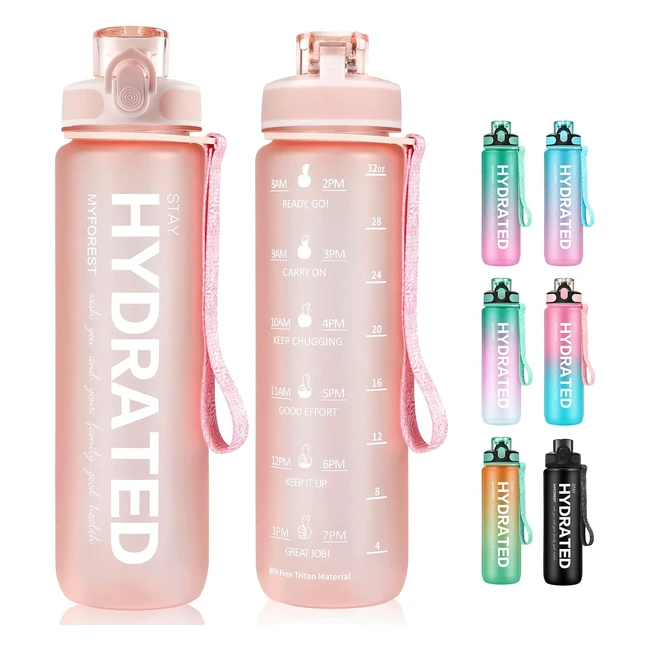 Stay hydrated with the myforest 1 litre water bottle featuring motivational quotes, time markers, and a durable design. Made of food-grade environmentally friendly tritan, this BPA-free sports water bottle is perfect for fitness goals and overall health. The portable design includes a wrist strap, reflective frosted shell, and leak-proof flip top lid with a secure lock. Enjoy an innovative drinking experience with a detachable straw and fast water flow mouth. Ideal for gym, camping, running, yoga, weight loss, home, and office. Quality assurance guaranteed. Contact us for any questions. Not dishwasher safe or for hot liquids.