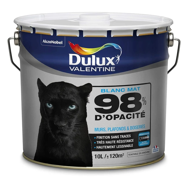 -15%Peinture Dulux Valentine Blanc Mat 98 pour murs, plafonds et boiseries. Rendement de 12m2/litre en une seule couche. Facilite vos chantiers, finition opaque et résistante. Temps de séchage rapide. Commandez maintenant!