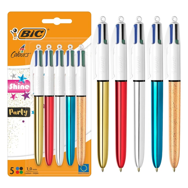 Penne a Sfera Retrattili BIC Shine and Party - Punte Medie 1mm - Argento Metallizzato Oro Rosso Blu - Confezione da 5
