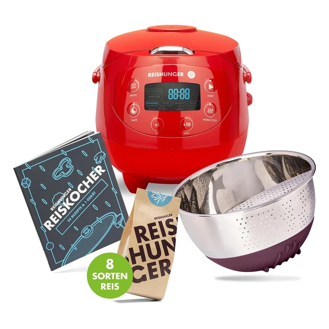 Reishunger Reiskocher klein rot 06 l für 3 Personen 11-teiliges Starter-Set inkl. Reiswaschschüssel Kochbuch und 8 Reissorten