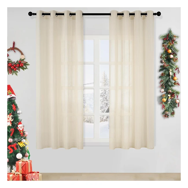 Rideau de cuisine court beige Topfinel - Motif rayures verticales - Effet lin - 140x145cm - Lot de 2