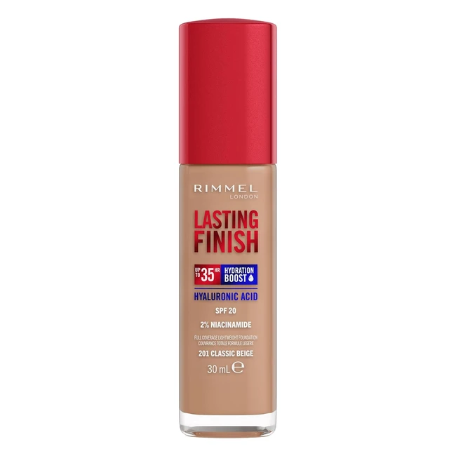 Achieve a flawless look with Rimmel Lasting Finish 35 Hour Foundation in 201 Classic Beige. This full coverage liquid foundation provides a natural, healthy-looking finish with unbeatable hydration from hyaluronic acid, niacinamide, and vitamin E. Enjoy up to 35 hours of wear that stays all day, outlasting the top 3 leading competitors in the UK market. With SPF20 to protect your skin from the sun, this foundation is breathable, sleep-proof, waterproof, crease-resistant, and transfer-resistant. Clean, vegan, and cruelty-free formula.