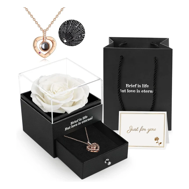 Acquista ora questa rosa stabilizzata vera, lavorata a mano con tecnologia speciale. Conserva la sua vividezza e bellezza per almeno un anno. Regalo romantico per lei. Mostra amore eterno per fidanzata, moglie, madre. Ideale per compleanni, San Valentino, festa della mamma, Natale e anniversari. Incluso ciondolo con scritta I Love You in 100 lingue. Confezione regalo inclusa. Spedizione rapida!