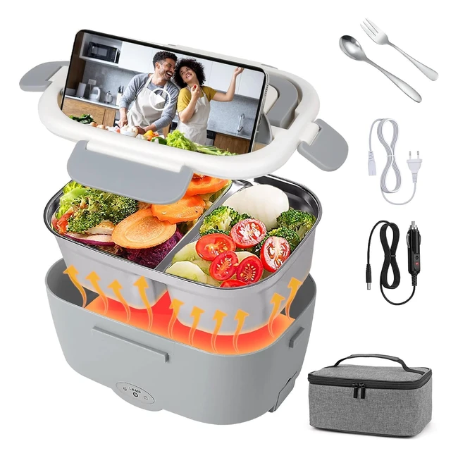 Portapranzo elettrico con alimentatore da 65W riscalda in 25-40 minuti. Design a doppia griglia 3in1 per auto e uffici. Materiale alimentare PP e acciaio inox. Ideale regalo per pranzi caldi e sani in viaggio o al lavoro.