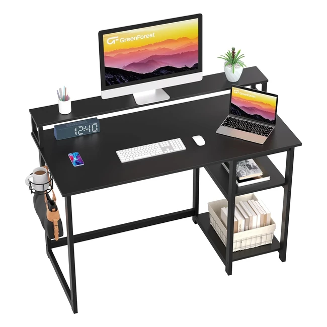 Scrivania Computer 120 cm Greenforest con Supporto Monitor, Ripiani Stoccaggio Reversibili, Ganci Cuffie e Tazza Nero