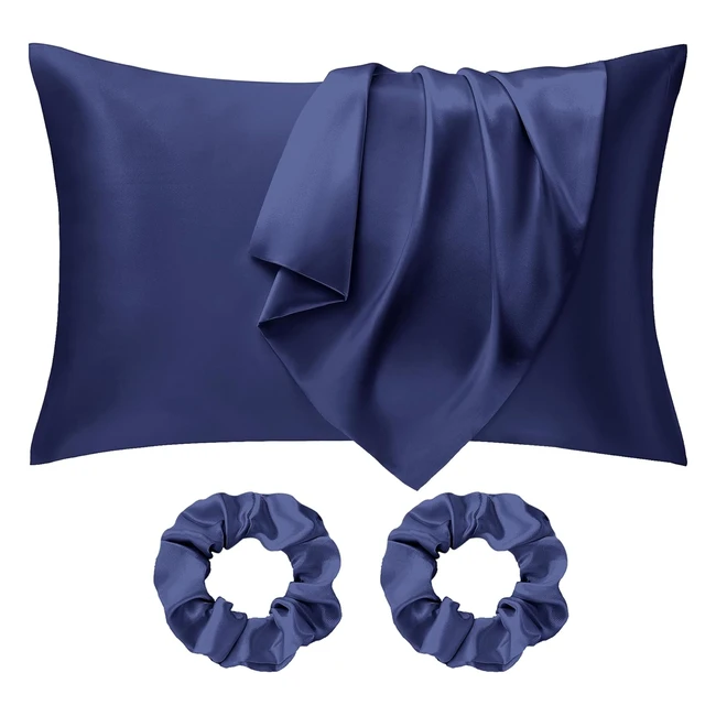 Seiwohl Satin Pillowcases 2 Pack + Hair Scrunchies Set - Navy Blue Standard Size 50x75 cm