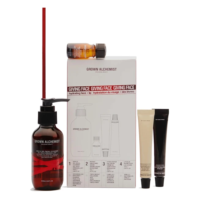¡Limpia y rejuvenece tu piel con este set de regalo Grown Alchemist! Incluye un suave limpiador facial en gel de 100ml, serum alisador instantáneo de 5ml, crema de día hydrarepair de 12ml y bálsamo labial hidratante de 12ml. ¡No te lo pierdas!