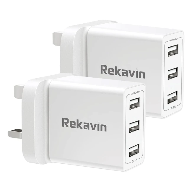 2 Pack USB Plug UK 3 Pin Mains Charger - Rekavin Multi USB Charger Plug Adaptor UK - Compact Triple Port Charge Head - 5V/2.4 Amp Charging for iPhone 11/11 Pro/10/XS/XS Max/XR/8/7/6 Plus, iPad, Samsung Galaxy
